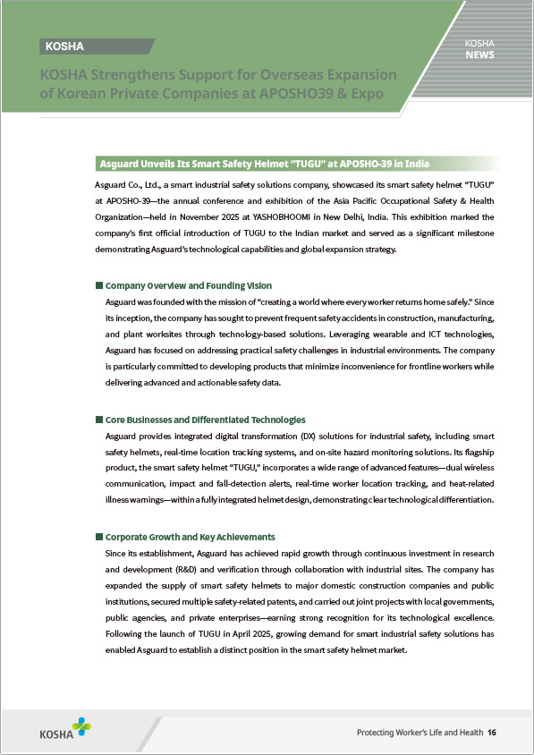 아스가드는 **스마트 안전모 ‘TUGU’**를 중심으로 자사의 산업안전 기술력을 해외에 공식적으로 소개했다.
