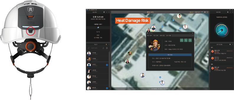 The temperature and humidity sensor located at the back of the helmet measures workplace conditions and displays the data on the app and integrated monitoring