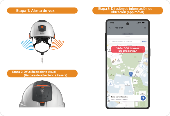 Fase 1: Difusión de alerta sonora Fase 2: Difusión de alerta visual (luz trasera de alerta) Fase 3: Transmisión de información de ubicación (app celular)