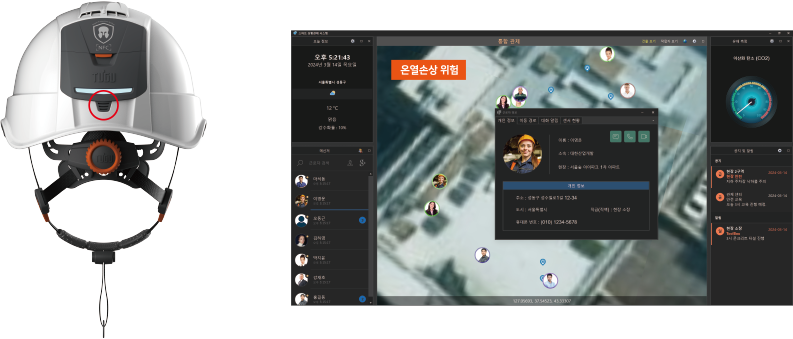 안전모 뒷편 온습도 센서를 통해 작업장의 온습도를 측정하여 앱 및 통합관제 프로그램에 표시 설정값 초과시 온열손상 위험 경보