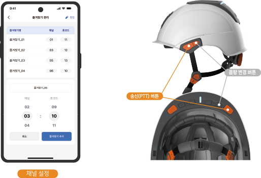 모바일 앱 에서 5개 즐겨 찾기 채널 설정 후 안전모 우측 스피커 아래의 버튼으로 채널 변경 및 무전 송신 가능
